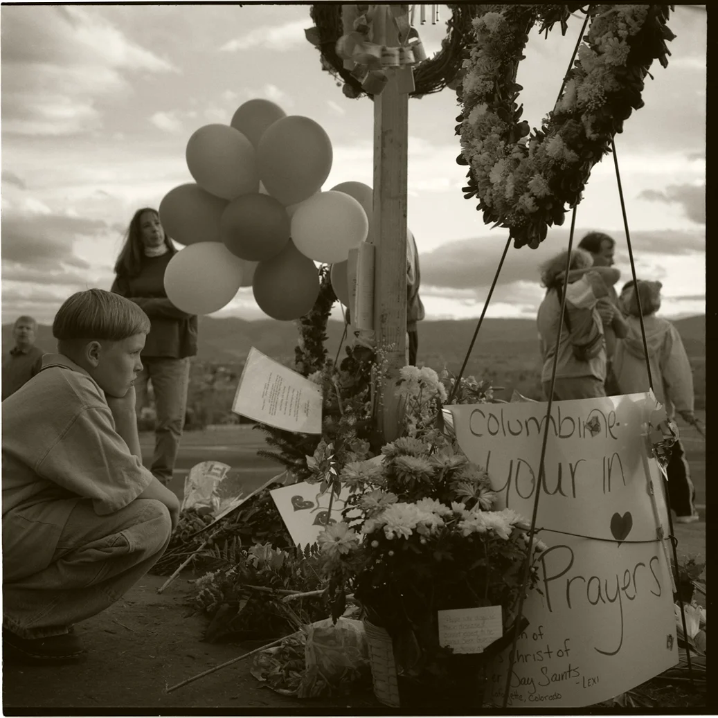 I was flying home from China when the Columbine shooting was taking place. It was on all the televisions when I landed in LA. Two days later, we flew to Colorado for an ad shoot and drove out to the high school on our way to Denver. A rambling makeshift memorial spread out along the fence and the parking lot was full. Adults and kids wandered the scene reading the notes and placing their own.